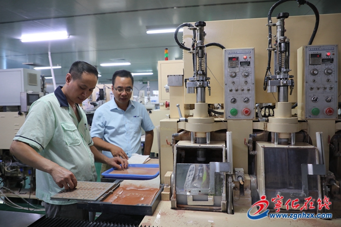 總經(jīng)理吳小春(右)與工人進(jìn)行業(yè)務(wù)交流