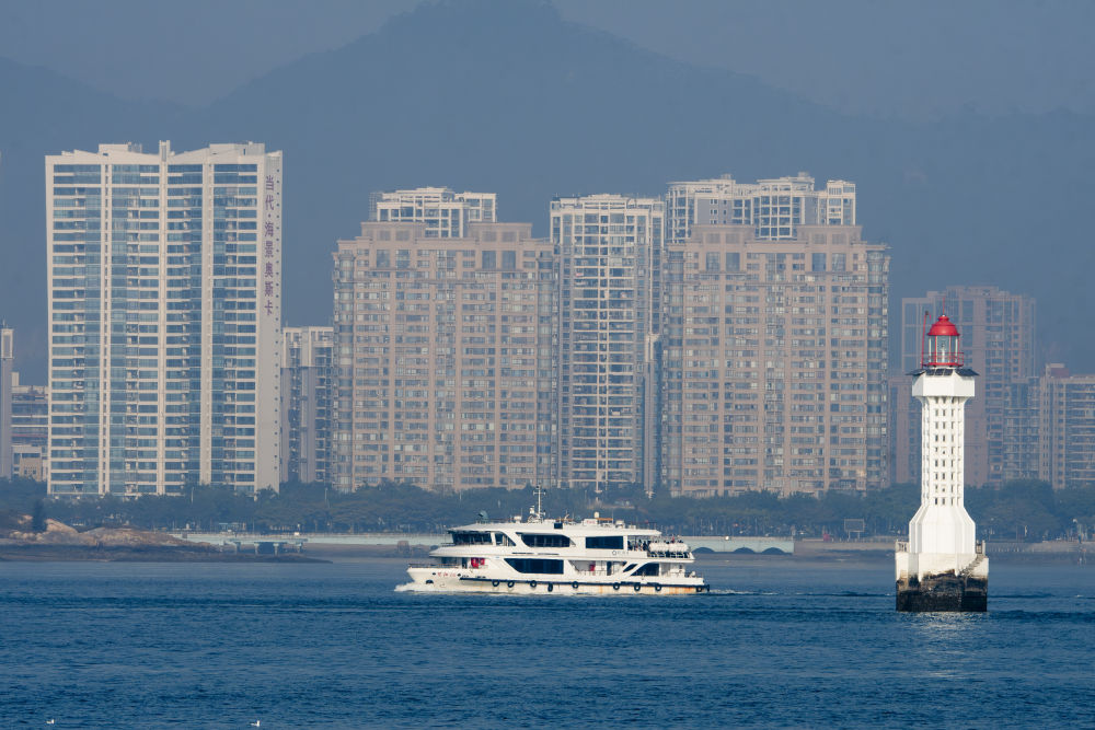 ??2024年1月5日,一艘游輪在廈門海灣公園附近的海面上穿行。新華社記者 魏培全 攝
