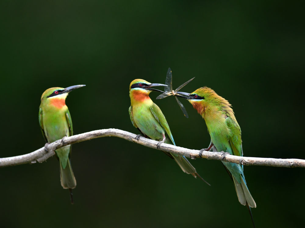 ??在廈門五緣灣栗喉蜂虎自然保護區(qū)騎馬山片區(qū),一只栗喉蜂虎雄鳥(右)給兩只雌鳥喂食昆蟲(2023年5月20日攝)。新華社記者 魏培全 攝