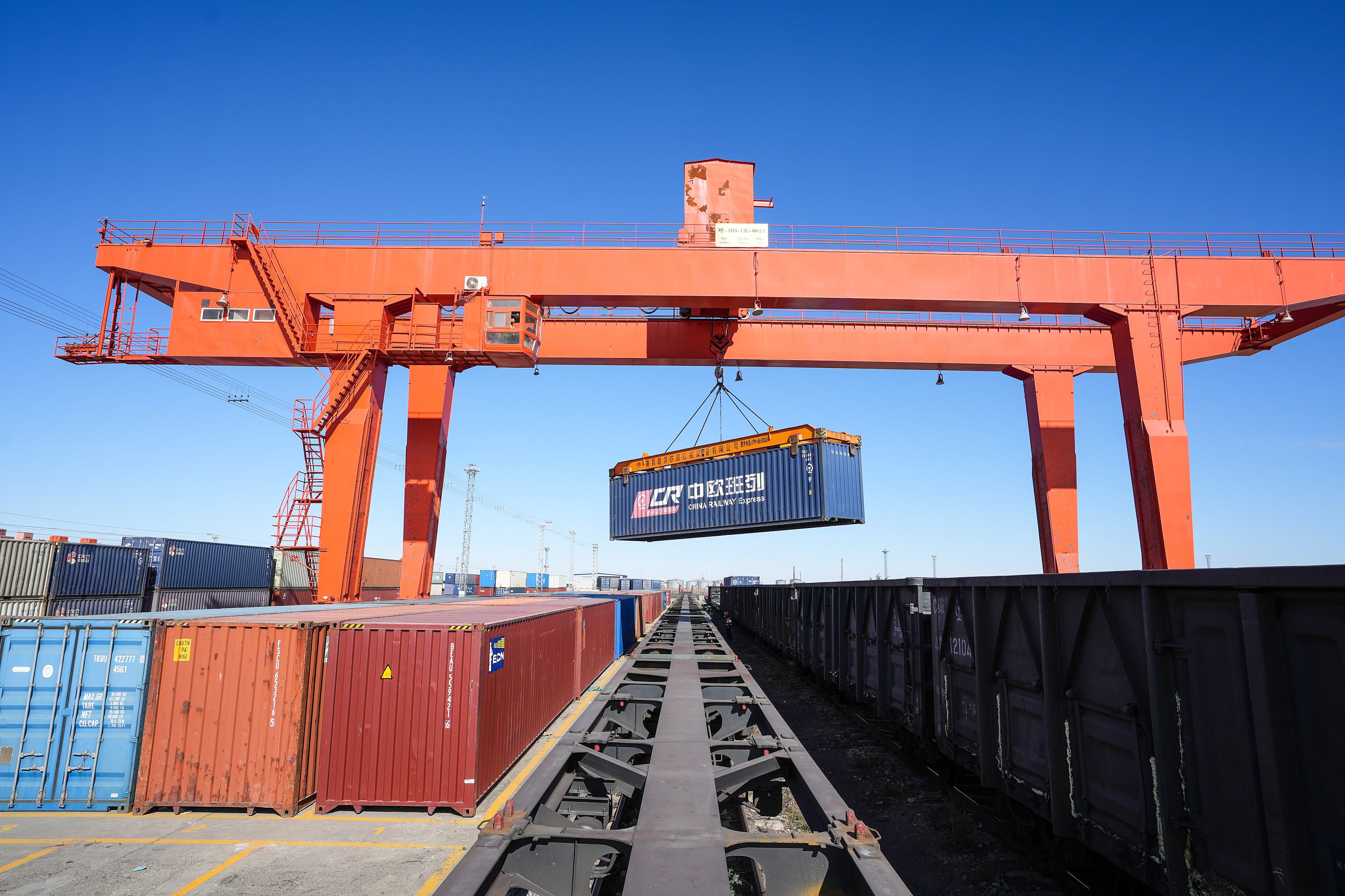 △ 內蒙古錫林郭勒二連浩特口岸鐵路貨場內,龍門吊正在吊裝中歐班列集裝箱。