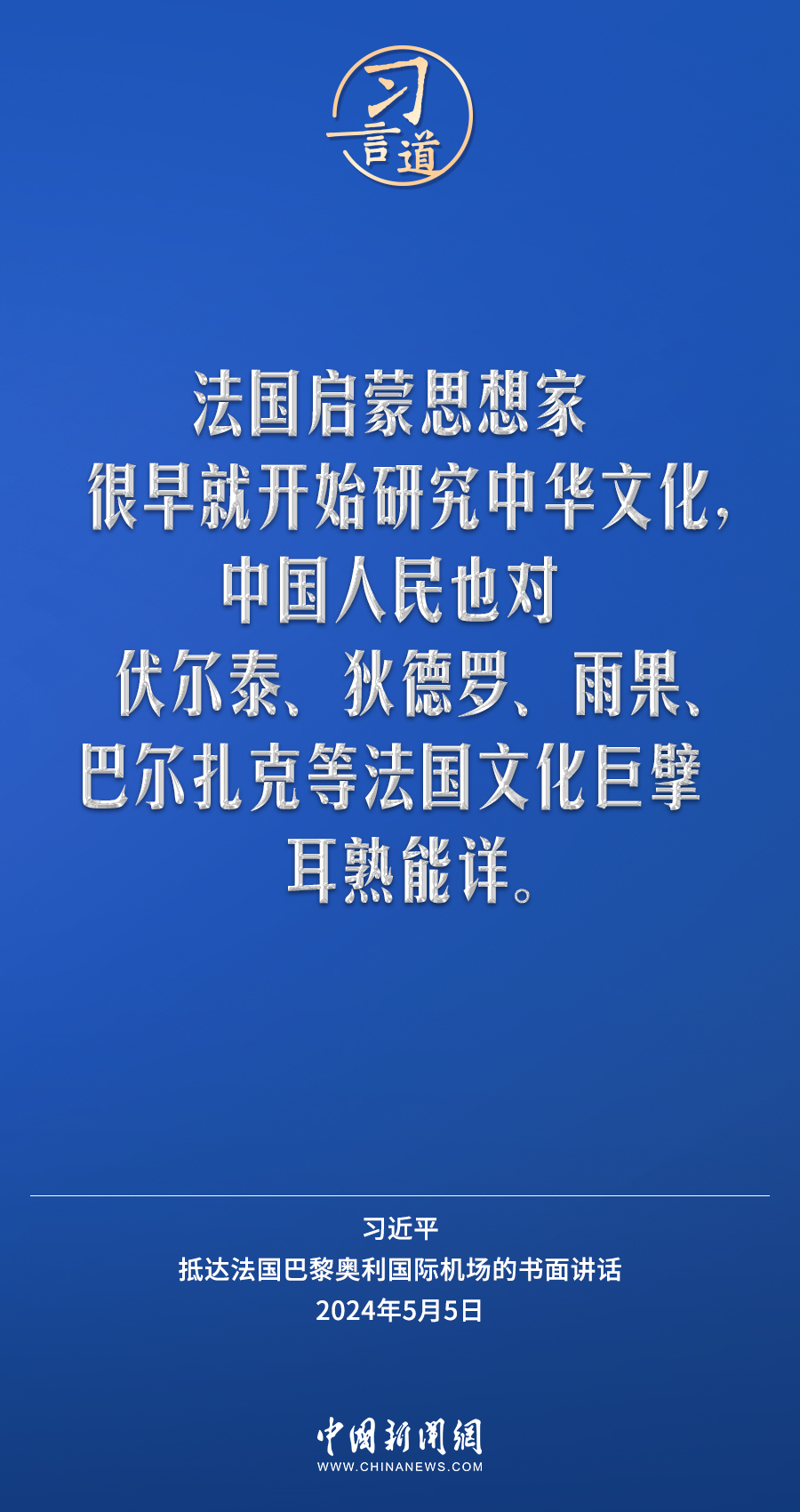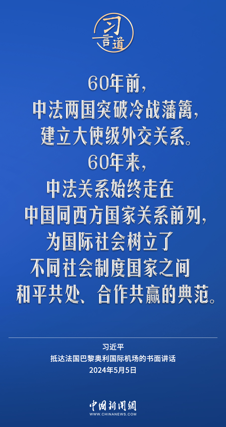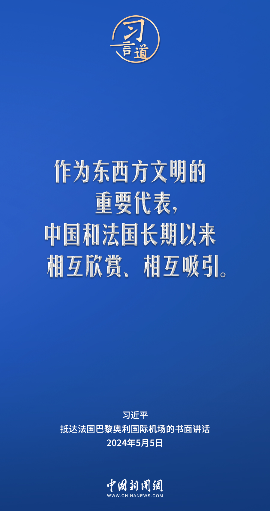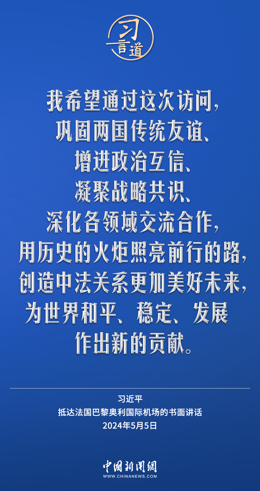 當(dāng)?shù)貢r(shí)間5月5日下午,國家主席習(xí)近平抵達(dá)巴黎,開始對(duì)法國進(jìn)行國事訪問。在抵達(dá)法國巴黎奧利國際機(jī)場的書面講話中,習(xí)近平指出——