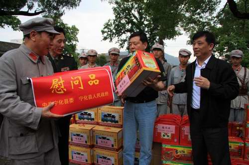 我市的慰問團成員中,還有來自寧化縣紅軍后代、離休老干部、革命烈士村及青年、婦女、學生的代表,他們是縣委、縣政府從眾多踴躍報名的群眾中挑選出來的。寧化鄉親們帶著當地自制的客家酒娘、客家紅薯粉絲等食品,將寧化老區人民對劇組的關心支持送到每一位演職人員的心坎上。總導演金韜飽含深情地說:“我們踏上閩西這塊紅色土地,就感受到了紅土地上山山水水的親切,就能體味到老區人民的熱情。當年老區人民為捍衛紅色政權,拋頭顱、灑熱血,做出了巨大的犧牲。今天老區人民給我們劇組送來了溫暖,也給我們送來了精神,讓我深受感動和鼓舞。我們演職人員一定會全力以赴,拍好這部戲?!?SPAN lang=EN-US>