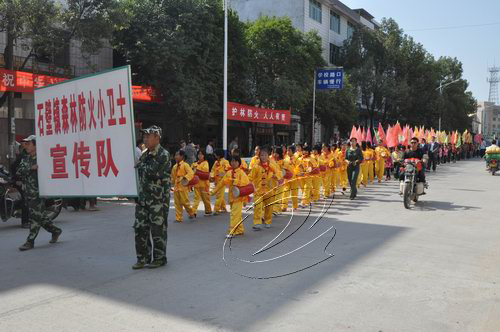 50名身著迷彩服的護林員扛著森林防火宣傳標語牌,30名“森林小衛士”敲著腰鼓,120名“森林小衛士”揮舞宣傳彩旗,他們排成長長的隊列在石壁墟場踩街,宣傳《森林防火條例》,趕墟的農民紛紛駐足觀看。