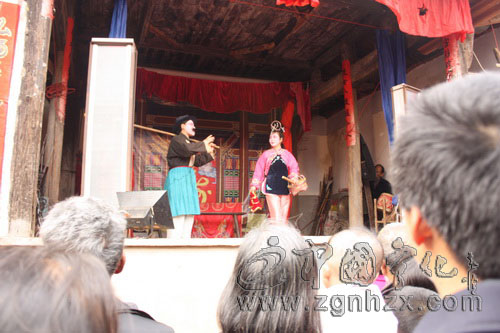 “雙手接過八字一張,吩咐之事記在心上,辭別員外府門外……”2月25日下午,寧化縣中沙鄉半溪村,爆竹聲聲,鼓聲喧天,原來這里正在表演祁劇《進寶珠》,吸引了百余名群眾觀看。