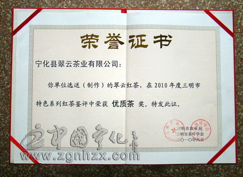 寧化翠云紅茶獲市特色系列紅茶優(yōu)質(zhì)茶獎