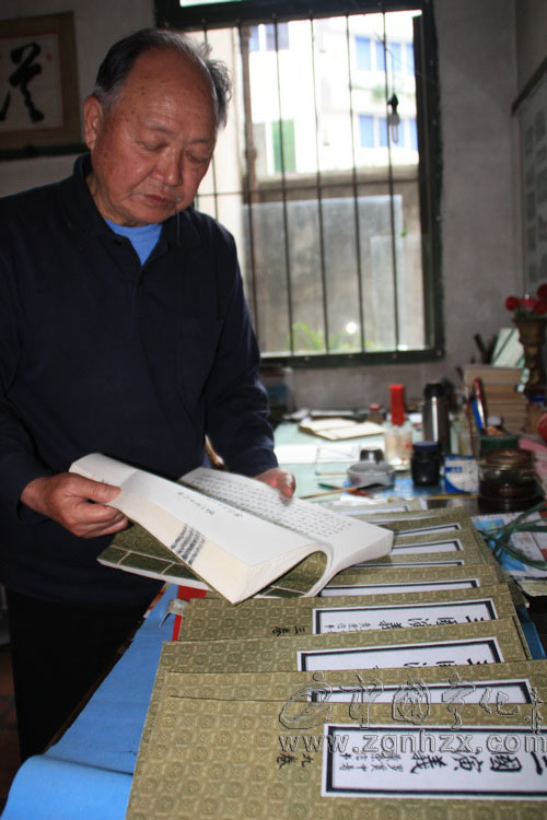 幾個(gè)月后,用毛邊紙抄寫的《毛澤東詩詞》完成,黃紙黑字,書寫俊秀,一筆一劃浸透著心血。黃老先生又親自把散的書頁裝訂好,裹上書皮。“當(dāng)時(shí)我就覺得給兒孫抄出了一筆財(cái)富,至少是精神財(cái)富?!?st1:PersonName w:st="on" ProductID="黃老" xmlns:w="#unknown2" xmlns:st1="#unknown1">黃老先生說。老伴看著這個(gè)成果,也很激動(dòng),后來外出有人問:“怎么沒看到黃榮信呢?”她就會(huì)自豪地答:“在家里抄書呢?!?SPAN lang="EN-US">