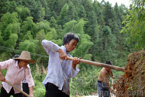 為此,謝坊村黨支部急村民之所急,經村兩委協商后提出倡議,開展一次“黨員奉獻日活動”——清理通往都坑組水泥路的塌方。這一提議立即得到村黨支部全體黨員的熱烈響應。當日,謝坊村所有在家黨員在安樂鄉掛村干部謝主席及村支部書記、村主任的帶領下,于早上8點就聚集在通都坑組水泥路上塌方處開始了清理土方的工作。在勞動現場,記者看到,40多人分成三個勞動小組,有的在清除塌下的土方,有的在鏟除路面的淤泥,還有的在填裝土包,進行路肩的加固。在場的黨員中,不但鄉村兩級黨組織的干部奮勇爭先,74歲高齡的童長發、許壽老兩位老黨員也不甘落后,63歲71年入黨有40年黨齡的李胡蘭大媽更是勞動好把式,手中的鋤頭揮得呼呼生風,轉眼間,一處塌方在大家的齊心合力下就被清除了。