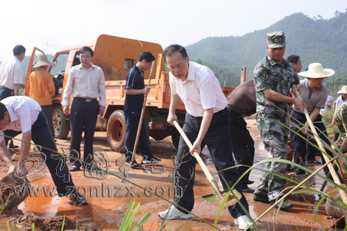 ?? ?7月1日,驕陽似火。寧化縣華僑經(jīng)濟(jì)開發(fā)區(qū)內(nèi)黨旗飄飄,縣委書記陳忠杰,縣長巫福生,縣人大常委會主任林福生,縣政協(xié)主席劉日太等幾套班子領(lǐng)導(dǎo),以普通黨員的身份,和縣直機(jī)關(guān)黨委100余名黨員干部一起,揮鍬掄鏟,為福建鑫宇有色金屬制品有限公司廠房右側(cè)公路清淤,用這一特殊的方式來慶祝黨的89歲生日,為災(zāi)后重建奉獻(xiàn)一份力量。