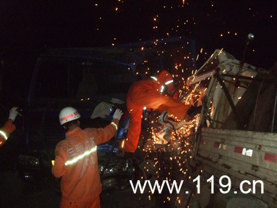 21時26分,消防官兵到達(dá)現(xiàn)場。事故現(xiàn)場一片狼籍,一輛正在上坡的東風(fēng)大貨車與一輛滿載水產(chǎn)品的小貨車迎頭相撞,車頭嚴(yán)重變形,并且兩輛車駕駛員都被死死困在駕駛座上,身體有多處部位受傷,雙腿均被變形的車頭緊緊擠壓在駕駛室前側(cè)與方向盤下,情況十分緊急。