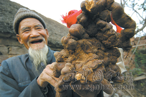 ??? 經詢問中醫得知,野生人形何首烏若是真的,最少要長30年,形態不十分規則,質地堅硬,有韌性,不容易折斷。筆者看到的這株人形何首烏,形態規則對稱,表面平滑,根須不多,易流漿質,與野生何首烏性狀相差甚遠,可以斷定,這株人形何首烏是人工嫁接山藥或其它速成塊莖套用模具培植而成的。