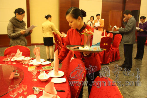 ???? 上午8:30,比賽正式開始,來自天鵝大酒店、含笑大酒樓、深海魚等8家酒店、酒樓的24名參賽選手以3人一組,每組限時14分鐘的形式展開競技。在比賽中,參賽選手擺碗碟、放杯盞、疊餐巾,姿態優雅、秩序井然。只見餐桌上一個個骨碟定位均勻;餐碟和筷子擺放講究,位置整齊;餐巾花式各異,形狀挺拔。選手們認真的態度,嫻熟的技能,精彩的表現贏得了評委們的一致好評。