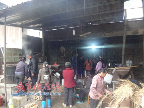 ??? 今年淮土油茶豐收,各村茶油加工作坊從11月初就忙活開了。“我們每天從上午8點就開始忙活一直到第二天凌晨1時多才能休息,附近村民都會過來榨油,估計要到月底才榨得完。一天能出油1000來公斤,量雖然不大,但工序比較復(fù)雜,先要碾粉、烘炒、然后蒸粉、包餅,最后才上機榨油。”鳳山村榨油作坊主王興利對筆者介紹。