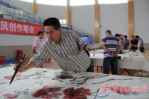 ??? 當日上午,書畫家們先后走訪了縣客家博物館、塔山公園等地后,在縣體育館舉行了書畫創作筆會。書畫家們鋪開宣紙,盡情潑墨揮毫,把在寧化的所見所聞所感,融注在細膩的筆端上。隨著手中筆鋒的翻飛轉動,30余副書畫作品出爐。期間,省市書畫名家們還集體合作,為即將并落成的客家祖地博物館創作了八尺巨幅花鳥國畫《花開五福香飄四海》。寧化書畫愛好者現場觀摩了畫家們的創作。