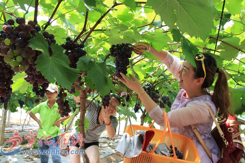 火辣辣的太陽醞釀出葡萄園的芬芳。6月28日,寧化縣石壁現代農業觀光園里,游客在開心地采摘“夏黑”葡萄。今年該園500余畝生產區葡萄掛果豐產,主要栽種夏黑、金手指、醉金香等21個葡萄品種,預計產量達30萬公斤左右,價格每公斤從36元到56元不等。自6月20日以來,吸引八方游客攜家帶口自駕車前來享受采摘樂趣,日均采摘葡萄1000公斤以上。2013年8月,石壁夏黑葡萄獲省葡萄果實鑒評優質果金獎。 (張麗勍 夏雨琳)