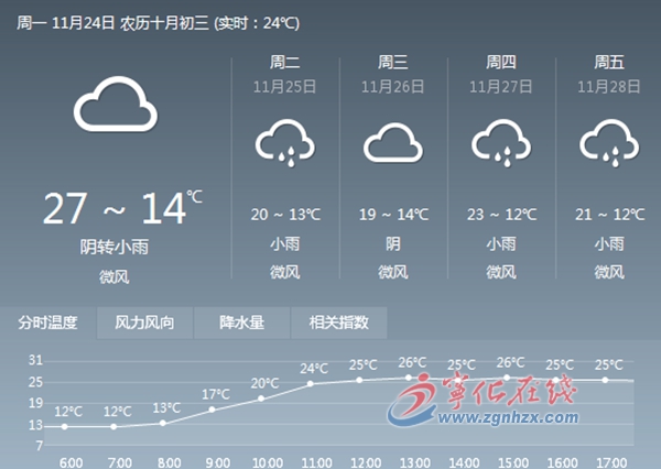 11月24日,記者從縣氣象局獲悉,本周寧化以過程性天氣為主,降水日數增多,晝夜溫差較小,最高氣溫27℃,最低氣溫9℃。