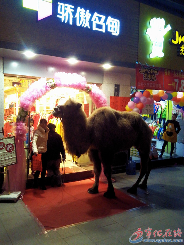??? 2月5日晚上8時許,寧化縣城區(qū)南大街的步行街內(nèi)燈火輝煌,人潮涌動。在絡(luò)繹不絕的行人中,一名衣衫不整的中年男子竟?fàn)恐活^瘦骨嶙峋的駱駝,沿著街道挨家挨戶向店主乞討,過往市民紛紛停下拍照、圍觀。