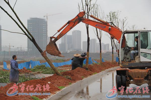 “來!加把勁,把樹扶正了。”3月11日,天空飄著濛濛細雨,寧化縣江濱北路、新橋路等地,工人們在挖掘機的幫助下種下了1000余棵樹苗。