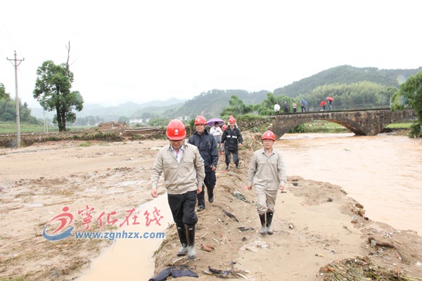 ??? 5月21日13時20分,省電力公司總工程師周剛帶領(lǐng)運(yùn)檢部主任王永明一行,在三明公司總經(jīng)理羅克偉陪同下,冒雨來到寧化水毀重災(zāi)區(qū)安樂鄉(xiāng)謝坊村1號變,“5.19”特大洪水倒桿斷線搶修現(xiàn)場檢查指導(dǎo)工作。
