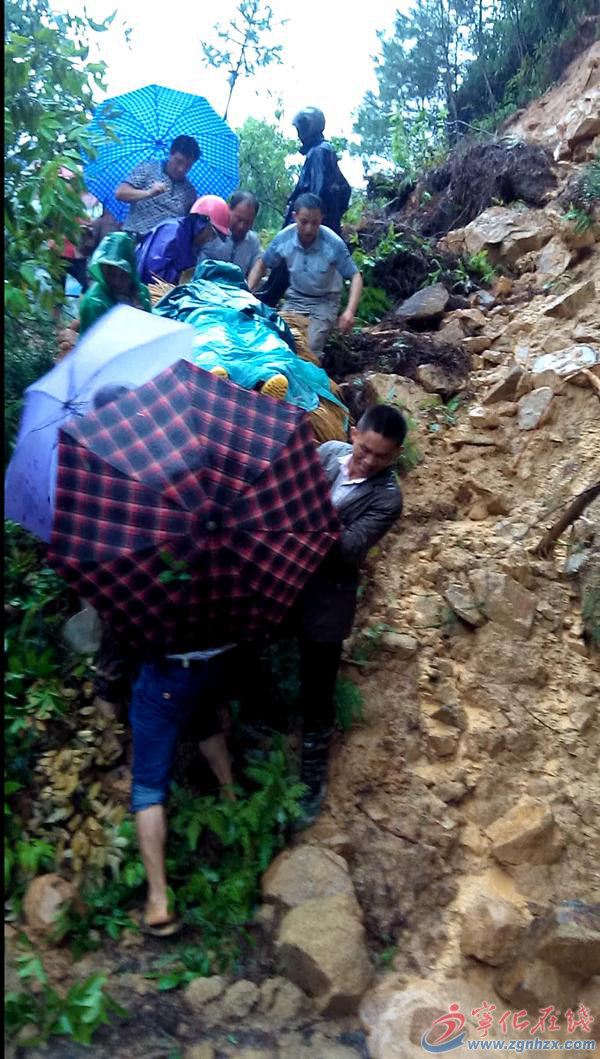 隆陂村,黨員干部帶領群眾在崎嶇泥濘山路上抬護受傷老人