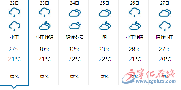 天氣具體預(yù)報(bào)如下:22日:陰到多云,有小雨,26℃~20℃;23日:陰有小雨,29℃~20℃;24日:陰到多云,32℃~20℃;25日:多云,33℃~22℃;26日:多云,有陣雨,28℃~21℃;27日:陰轉(zhuǎn)小雨,27℃~20℃。(張茜茜 吳鳳珠)