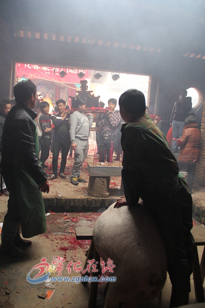 ? ? 面對天官,小伙們聳動肩膀,把大小菩薩搖動起來,等天官把各種吉祥發(fā)彩說完,小伙子們又把菩薩轉(zhuǎn)回廟里。這時,村里的屠夫,手腳干凈利索地把祭祀的豬宰了放血,紙錢打醮后,在鞭炮的轟鳴聲中,小伙子們以最快的速度,抬起華光尊王等菩薩在村里奔跑巡游,所到之處,街巷兩邊的人家都會燃放鞭炮,來迎接尊王、祈福平安。