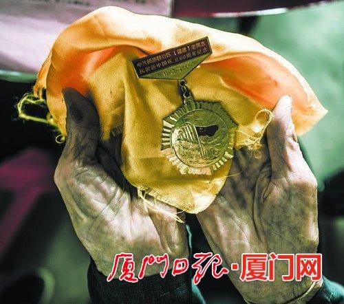廖逢祥手捧著老同志紀念章,他曾經是一名游擊隊員。