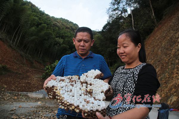 ?曹學(xué)良(左)手托著挖出來的蜂巢