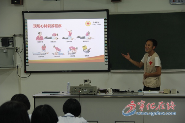 培訓中,紅十字應急救護師俞長廷、陳華珠、伍澤暉首先介紹世界紅十字運動起源,再從日常生活中需要應急救護的情境,引出應急救護的意義,為該校800多名新生生動講解了心肺復蘇和氣道梗阻應急救護相關知識。縣總醫院急診科護士長蘭桂華、應急救護培訓師張標琪配合示范操作,為同學們演示心肺復蘇操作流程以及氣道梗阻操作要領。