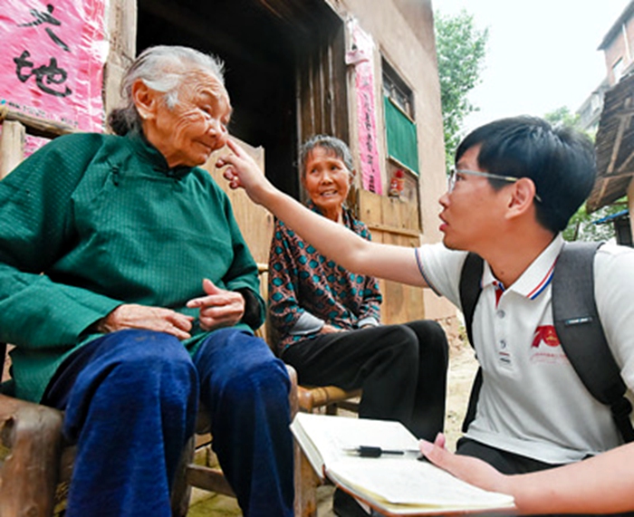 6月12日,在福建寧化縣鳳山村,紅色娘子軍家屬李三崗女講到親人犧牲時(shí)潸然淚下,記者替她擦去眼淚。余杉芳攝