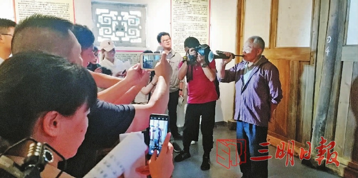 6月13日,在寧化縣泉上鎮的東方軍指揮部舊址,羅云清老人正在為到訪的客人吹奏軍號。(本報記者 詹鐵笛 攝)