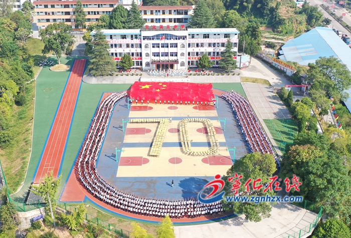 ? ? 師生們沿操場跑道站成巨大的橢圓形,環繞著由課桌拼成的“70”的圖案、巨幅五星紅旗,構成一幅壯美的畫卷。師生們揮動手中的紅旗,齊聲高呼“我愛你,中國”,歡慶新中國成立70周年。(賴全平 俞祥明)