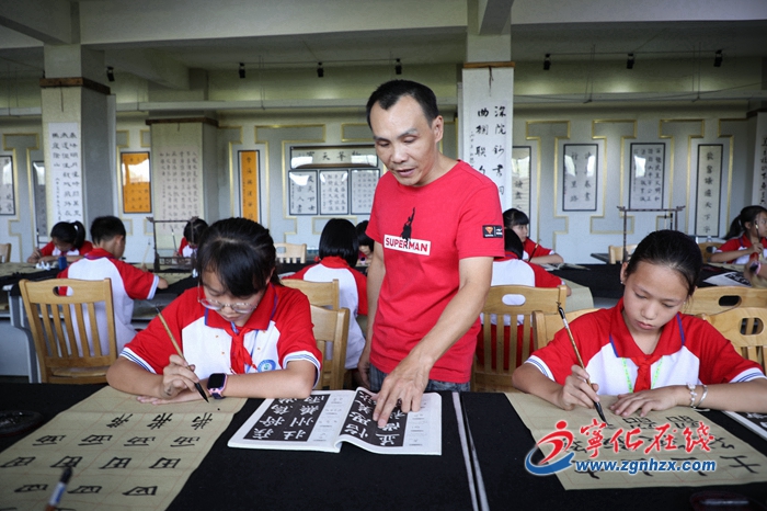 圖為在安遠(yuǎn)鎮(zhèn)中心學(xué)校,書法教師指導(dǎo)學(xué)生。(賴全平攝)