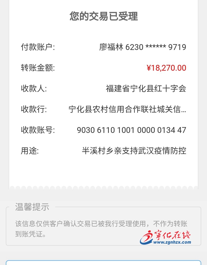 截止到2月4日晚,121名村民共籌集到善款26580元,已全部轉入寧化縣紅十字會,通過縣紅十字會轉捐給武漢。( 雷露微)