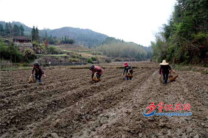 3月11日,寧化縣安遠鎮硝坊村200畝的種植基地上,村民正在翻土起壟,搶晴種植檳榔芋。