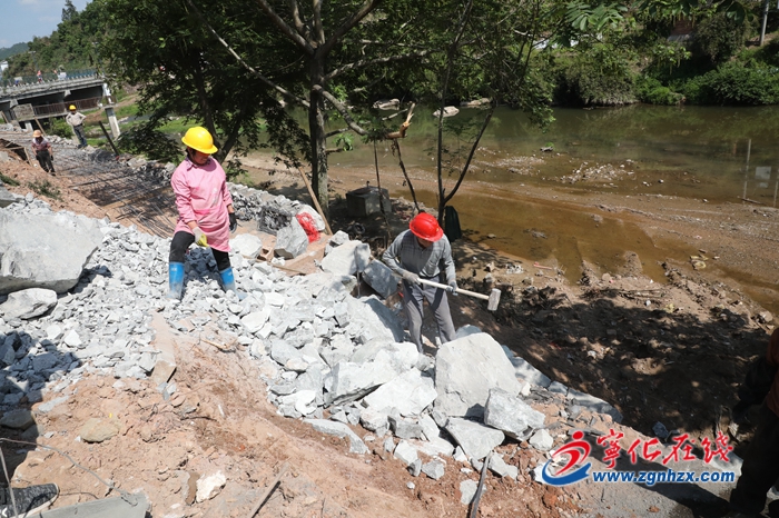 4月28日,寧化水茜溪陳家坊至茶園登段的施工現場一片繁忙,工人們正搶抓晴好天氣,進行河道擋墻砌石,固定基礎模板,澆搗混凝土。