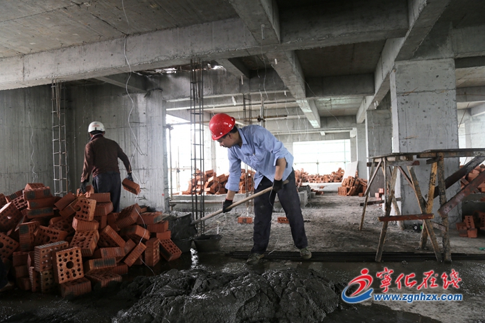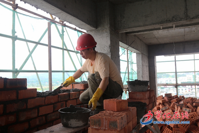 5月9日,在寧化縣金水河綜合批發市場項目施工現場,工人正在進行室內砌墻,項目主體已順利封頂。