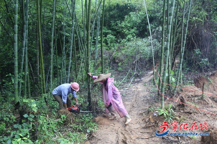 6月10日上午9時,在寧化縣水茜鎮廟前畬族村雷地組水毀道路搶修現場,村民們正冒雨清理塌方。