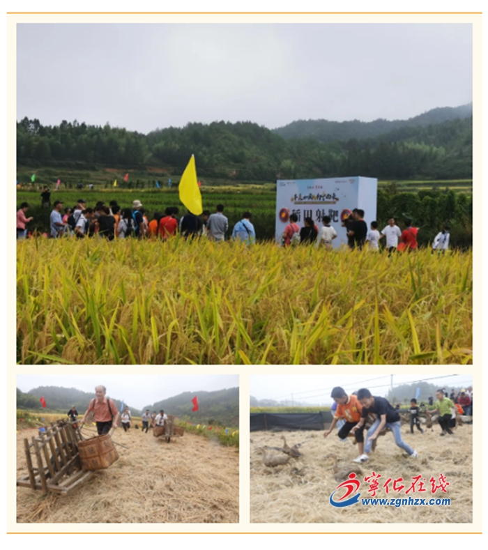現(xiàn)場還舉行了趣味農(nóng)事豐收大作戰(zhàn)體驗活動。在河龍貢米收割大比拼活動中,游客參加手動脫禾粒、獨輪車運糧等傳統(tǒng)的稻谷收割農(nóng)事體驗活動。趣捉稻鴨活動,游客們徒手在稻田里抓鴨子,你追我趕,體驗趕鴨、捉鴨的歡樂。稻田射靶比賽、垂釣小龍蝦等活動,參賽選手個個神情專注,享受活動帶來的樂趣。