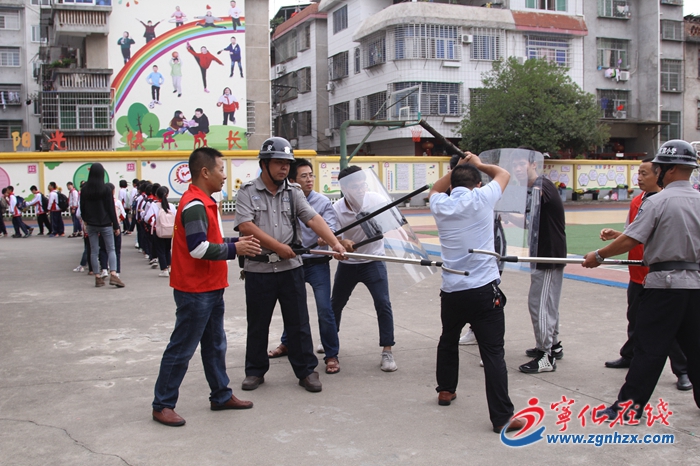 近日,寧化翠江派出所民警走進紅旗小學,參加該校防暴安全演練。紅旗小學模擬放學時段,學校大門剛打開,一名手持木棍的“醉漢”闖進校園,危及師生人身安全。保安、值日老師和家長志愿者馬上手持警棍、木棍、鋼叉等防暴工具進行防御堵截,并拔打110報警電話。值日行政立即向學校安全領導小組報告,應急指揮組長第一時間啟動應急預案,按響一鍵報警器。值日教師組織操場上的學生快速疏散,返回教室避險,班上學生保持警惕,做好應對準備。翠江派出所兩名民警及時趕到,迅速將“醉漢”制服,避免了校園暴恐安全事件的發生。