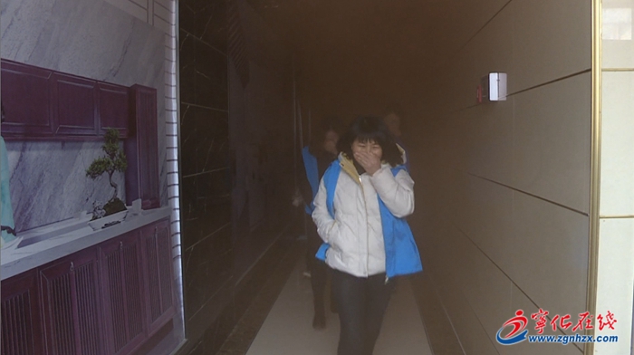 演練模擬居然之家商場二樓出現火點,商場值班人員發現火情后立即向119指揮中心報警,商場內部逃生警報響起,商場內所有人員有序的排著隊,弓著腰,用手、手巾等捂著口鼻,沿著安全逃生通道有序撤離到商場外的空地。
