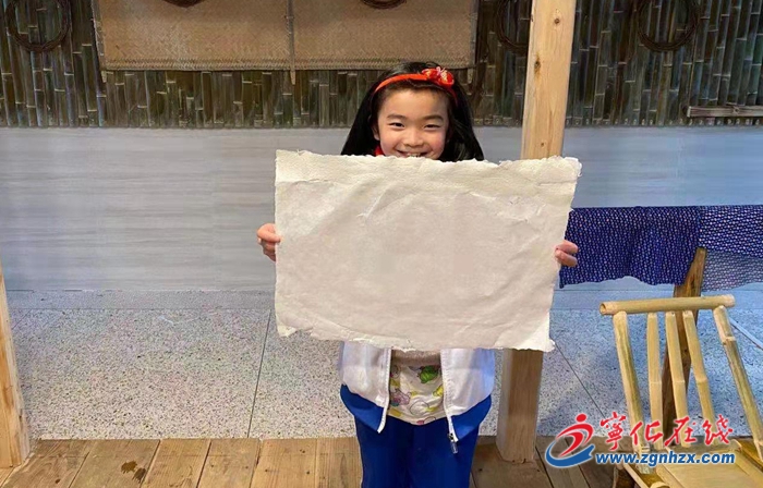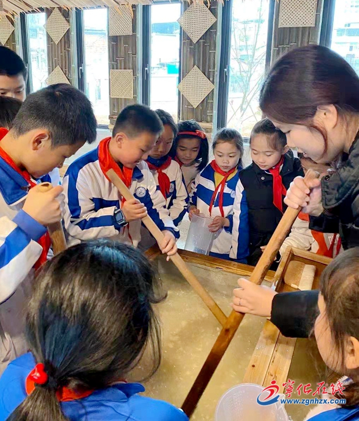 玉扣紙是寧化縣治平畬族鄉傳統手工藝名品,2019年,“玉扣紙制作工藝”被列入省級第六批非物質文化遺產代表性項目名錄。學生們在體驗館了解了玉扣紙制作流程中的砍料、浸塘、剝青、踏竹麻、做紙、焙紙、拔紙、裁紙等20余道制作工序,在觀看老師的示范后,對其中的一些步驟進行操作體驗。