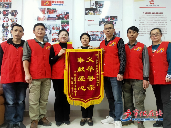 “能夠在有生之年找到遠方的親人,我們全家都非常高興!”4月8日,寧化翠江鎮中山路水門古巷八旬老人鄒良金在女兒鄒榮珍的攙扶下,將題有“義舉尋親、奉獻愛心”字樣的錦旗交到夢歸潮汕寧化助尋分隊負責人手中,感激之情溢于言表。