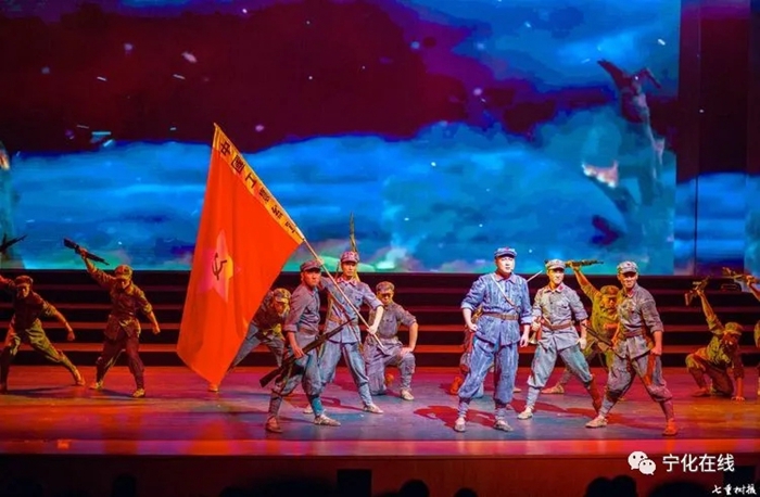 4月17日,來自寧化縣的基層演員李林蔚,在微信朋友圈曬出了情景交響音詩《風展紅旗如畫》排練照——8名“紅軍戰士”血戰湘江的場景,并配文:“準備戰斗,我們都是客家的好兒郎。”