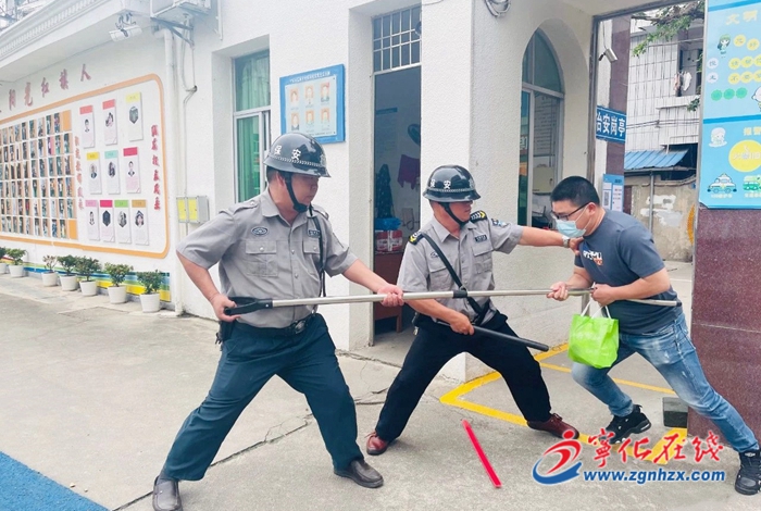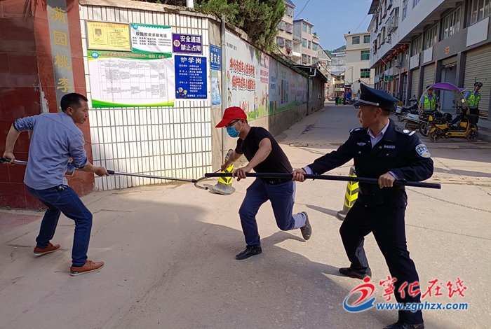 演練模擬學生排隊從食堂進入校園,一名“歹徒”持械企圖沖擊學生隊伍的情景。值日行政人員及安保人員立即手持鋼叉等器械堵截“歹徒”,現場教師立即組織學生疏散并報警,同時拉響警報。派出所民警隨后趕到,成功制服“歹徒”,學校恢復正常教學秩序。