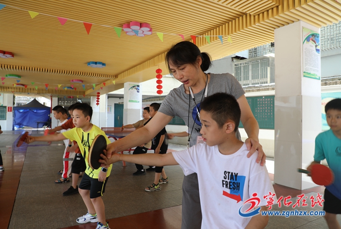7月21日,在寧化縣實驗小學操場上,教師李華正在指導20多名小學生練習乒乓球發球動作。寧化縣實驗小學首期共設3個校內托管班,共有70多名學生參加。