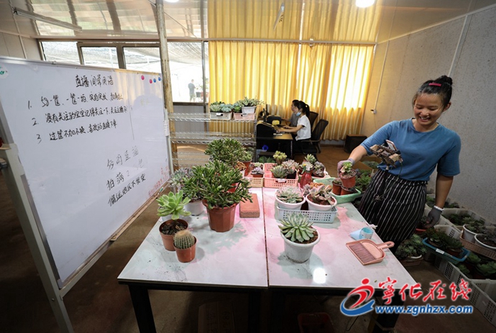 8月25日,走進安樂鎮謝坊村多肉種植基地,各種各樣的多肉植物分類整齊,直播間內主播正在直播銷售,直播間外工人們則忙著打包多肉盆栽,銷往全國各地。