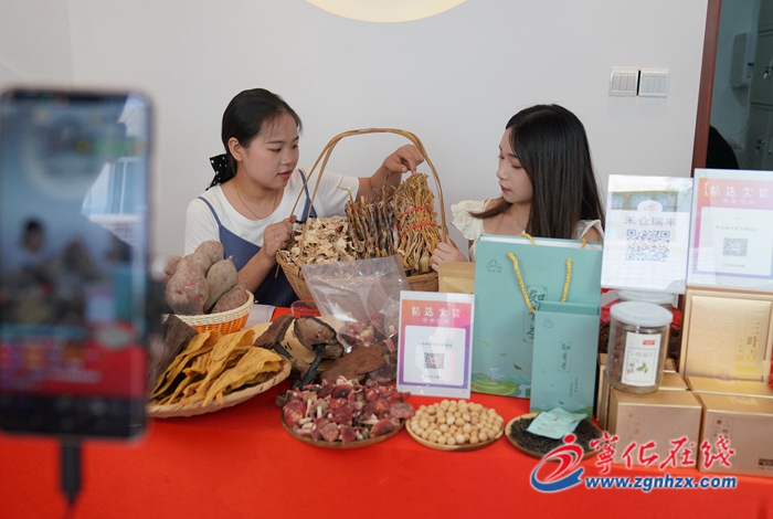9月2日,在水茜鎮樂農電商展示中心的直播間內,兩位主播正向觀眾介紹三葉青、靈芝、紅菇等當地特色農副產品,并不時回答網友提問,直播期間氣氛熱烈。