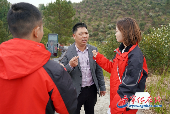 在淮土鎮傺下村嘉輝生態農林發展有限公司油茶種植基地里工作人員開啟線上直播,主播、網友在基地負責人帶領下共逛茶山。大家在茶林小道里暢游,邂逅漫山茶花,花香襲人,基地生態環保互補的種植方式也讓大家眼前一亮,讓大家忍不住駐足合影。