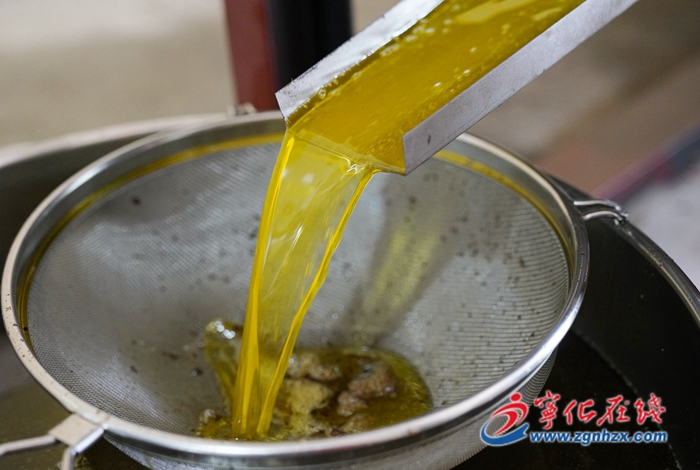 廠房內的工人正在有條不紊榨茶油,吸引了大家的目光。在茶油出產前,要歷經幾道工序。廠房內的工人先將脫殼曬干后的茶籽研磨成粉,加以蒸熟蒸透,制作成茶餅,機器壓榨出誘人的生茶油,再用高溫高壓過濾機器進行提煉,最終產出一桶桶香味撲鼻、色澤金黃、純凈透明的茶油。