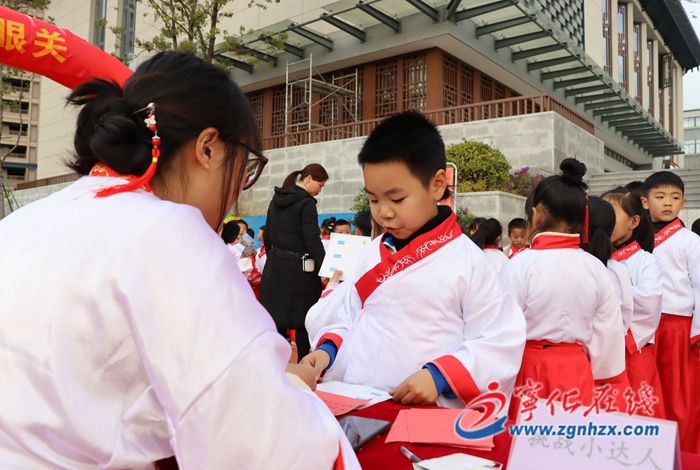 活動(dòng)在學(xué)校操場(chǎng)上舉行,同學(xué)們手持“闖關(guān)游戲”學(xué)業(yè)評(píng)價(jià)卡,暢玩“闖關(guān)游戲”。游戲分為探花關(guān)、榜眼關(guān)、狀元關(guān),每個(gè)關(guān)口采用抽簽形式答題,題目?jī)?nèi)容涵蓋拼音、漢字、閱讀、口算、數(shù)學(xué)應(yīng)用等,根據(jù)答對(duì)題數(shù)獲得相應(yīng)稱號(hào)及證書。